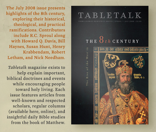 I was honored to be asked to write a “Pastor’s Perspective” article in the July, 2008, issue of TableTalk the devotional magazine of Ligonier Ministries. The entire issue deals with 8th Century and Christian controversies of that era. You can read my article by clicking HERE or you can read the entire issue on the 8th Century by clicking HERE.